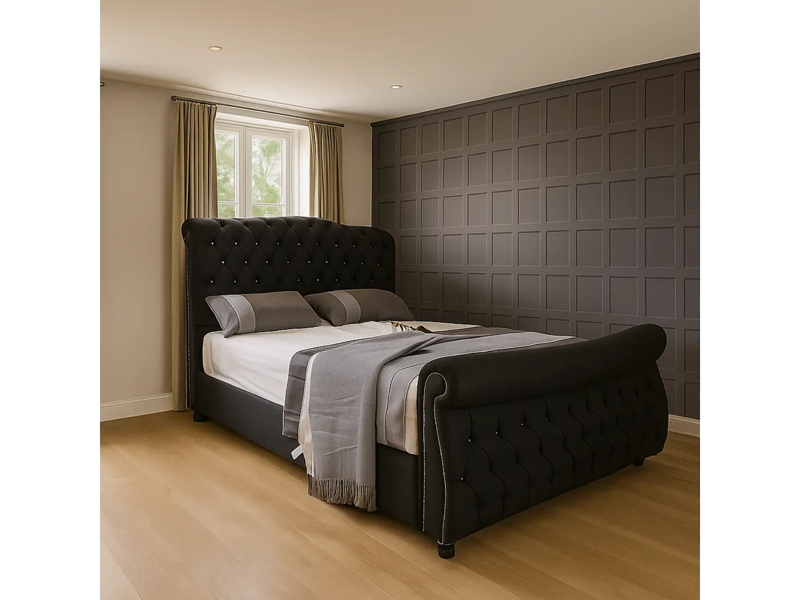 Lack of bedroom storage got you tearing your hair out? Relax, because our beautifully crafted Amber bed frame has great storage. The Amber Bed allows easy access to the underbed storage space – perfect for your linen, spare bedding or even a suitcase that you want to keep out of sight. But that’s not the only thing that makes the Amber great bed for any room. The design will enhance the feeling of Luxury, making your bedroom a sanctuary of Zen-like calm. The Amber Bed has a deep padded headboard, Foot end and sides with a panel design.