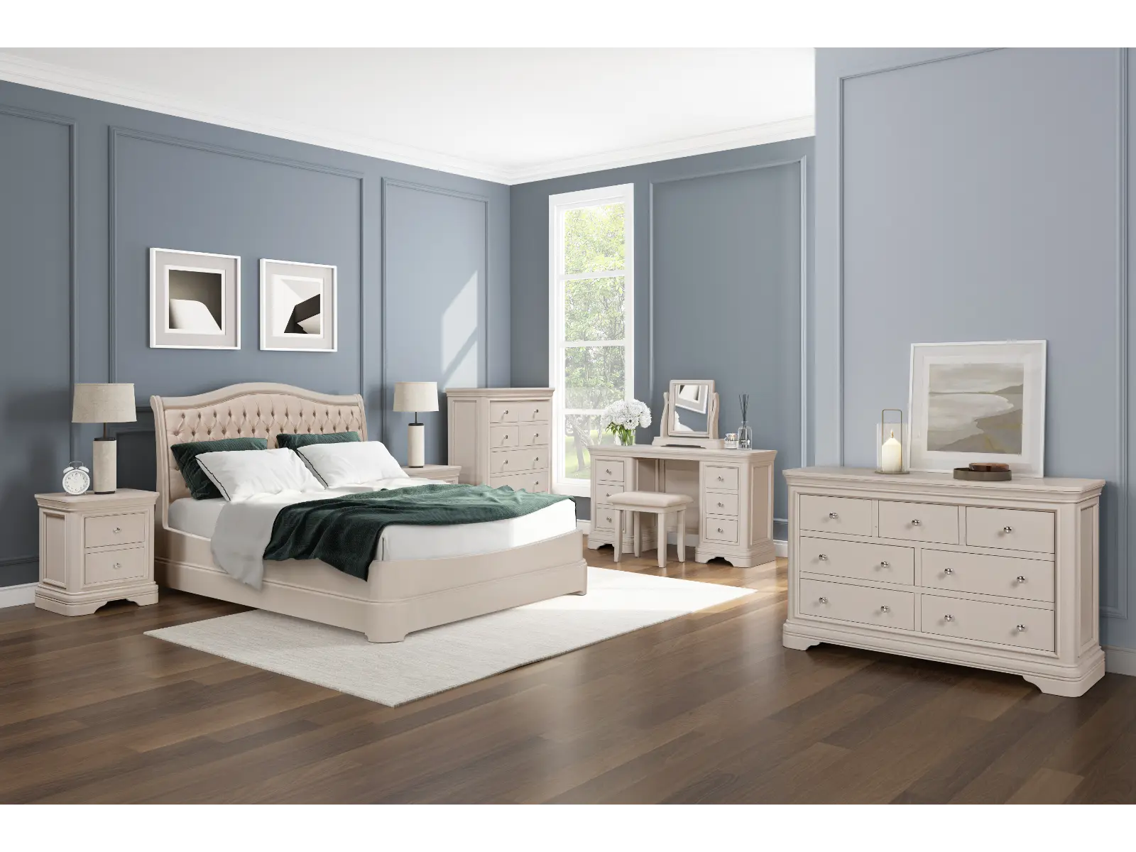 The Cambridge Bedroom furniture range features Stunning Chests, Wardrobe and beautifully upholstered Bedframe with soft curves and a neutral tones, perfectly complementing both modern and traditional interiors. Transform your bedroom into a sanctuary of style and serenity, Crafted with meticulous attention to detail, this elegant range offers both sophistication and practicality.
