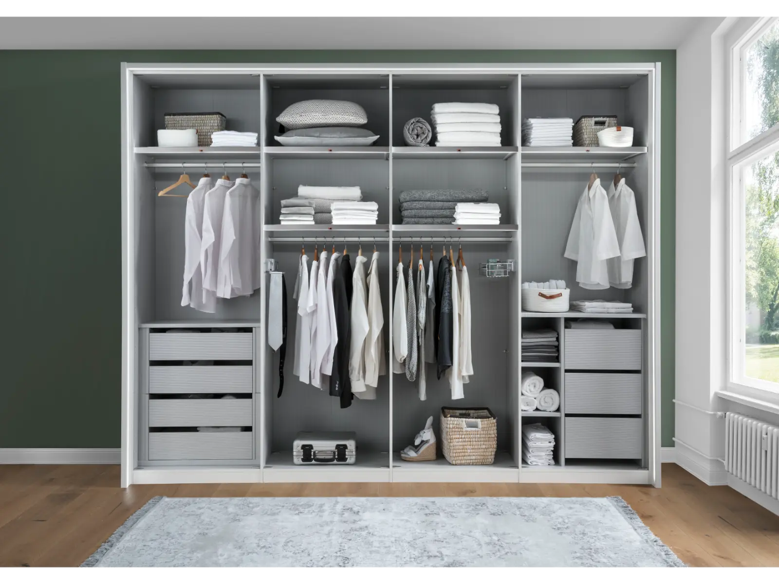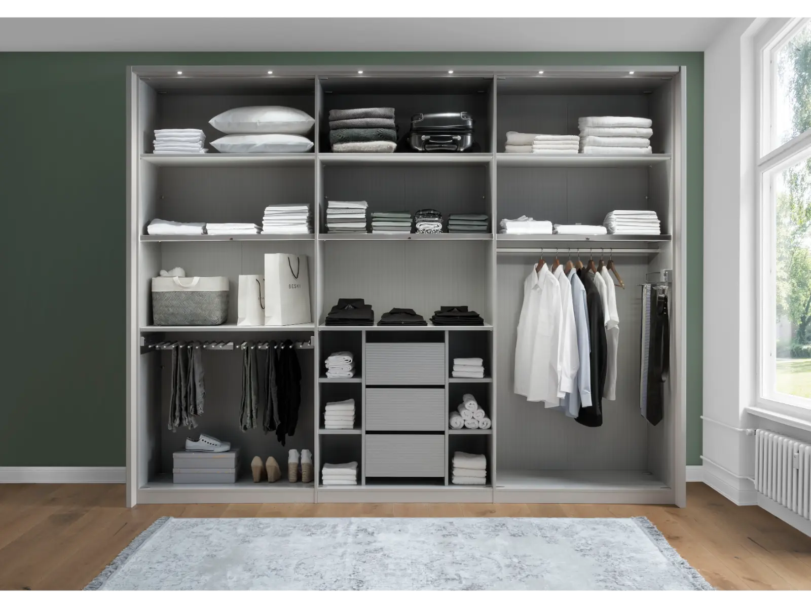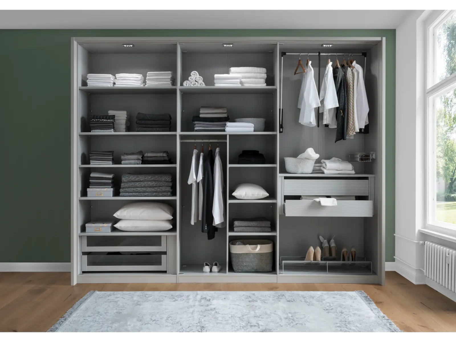 The Premium quality VIP Range Monaco wardrobe from Wiemann is a luxurious and high-end addition to any bedroom. It is designed with the finest materials and attention to detail, ensuring that it will last for years to come. The wardrobe fronts come in either carcase colour or glass fronts, with the latter being more stylish and visually stunning. The glass front gives a sleek and modern look to the wardrobe. The wardrobe is equipped with Bi-Folding doors that offer a panoramic view of the contents inside. The doors have a 95° opening angle, providing easy access to all compartments.