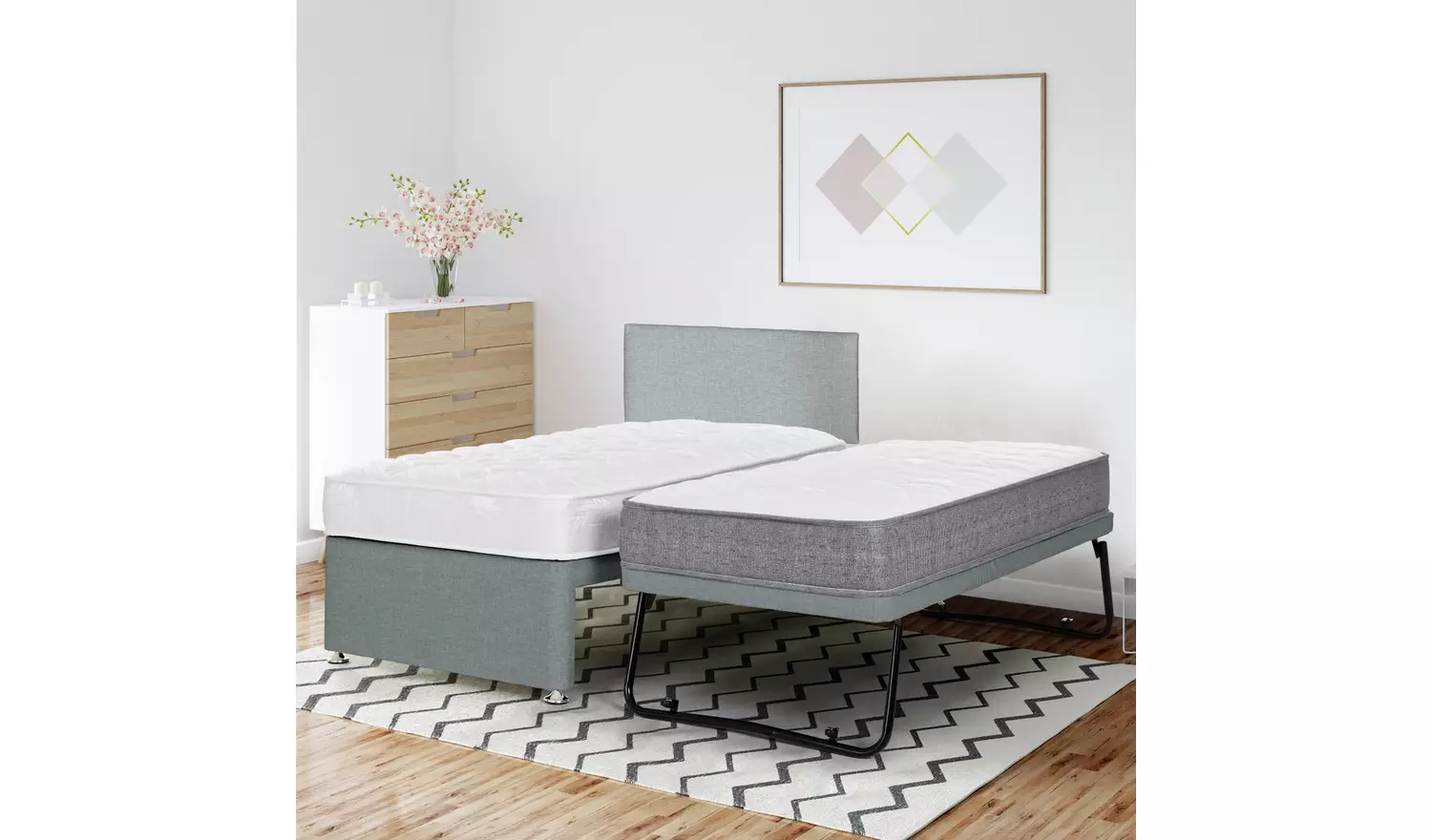 A Practical and Stylish solution for accommodating overnight visitors, this divan style guest bed offers comfort without taking up unnecessary space. The main divan base features a supportive standard 3′ x 6’3 mattress for occasional use while the second pull out bed neatly stores underneath and is 2’6 x 6’3. When needed, the guest bed glides out smoothly and can be raised to same height as the main bed, creating either two separate single beds or a larger double bed.